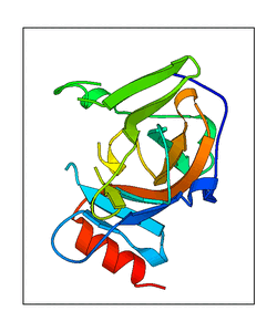 These views are prepared from three orthologuous viewpoints with MolScript. Secondary structures are determined from the C-alpha atom positions of your protein (N-terminal blue, C-terminal red).