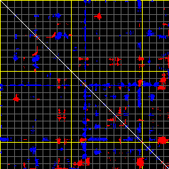 This matrix displays the maximum distance fluctuations between all pairs of CA atoms and between the two extreme conformations that were computed for this mode (DQMIN/DQMAX). Distance increases are plotted in blue and decreases in red for the strongest 10% of the residue pair distance changes. Every pixel corresponds to a single residue. Grey lines are drawn every 10 residues, yellow lines every 100 residues (counting from the upper left corner).