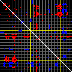 This matrix displays the maximum distance fluctuations between all pairs of CA atoms and between the two extreme conformations that were computed for this mode (DQMIN/DQMAX). Distance increases are plotted in blue and decreases in red for the strongest 10% of the residue pair distance changes. Every pixel corresponds to a single residue. Grey lines are drawn every 10 residues, yellow lines every 100 residues (counting from the upper left corner).