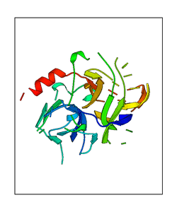 These views are prepared from three orthologuous viewpoints with MolScript. Secondary structures are determined from the C-alpha atom positions of your protein (N-terminal blue, C-terminal red).