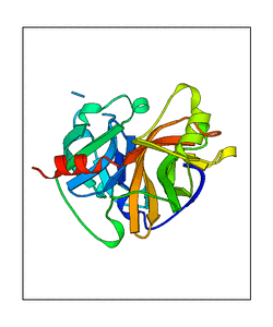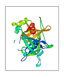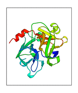 These views are prepared from three orthologuous viewpoints with MolScript. Secondary structures are determined from the C-alpha atom positions of your protein (N-terminal blue, C-terminal red).