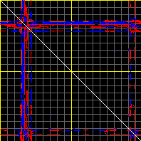This matrix displays the maximum distance fluctuations between all pairs of CA atoms and between the two extreme conformations that were computed for this mode (DQMIN/DQMAX). Distance increases are plotted in blue and decreases in red for the strongest 10% of the residue pair distance changes. Every pixel corresponds to a single residue. Grey lines are drawn every 10 residues, yellow lines every 100 residues (counting from the upper left corner).