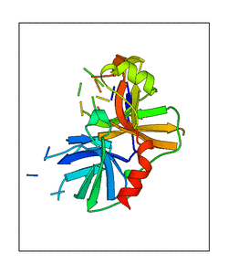 These views are prepared from three orthologuous viewpoints with MolScript. Secondary structures are determined from the C-alpha atom positions of your protein (N-terminal blue, C-terminal red).