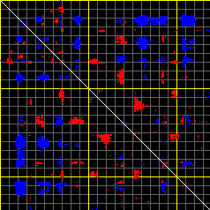 This matrix displays the maximum distance fluctuations between all pairs of CA atoms and between the two extreme conformations that were computed for this mode (DQMIN/DQMAX). Distance increases are plotted in blue and decreases in red for the strongest 10% of the residue pair distance changes. Every pixel corresponds to a single residue. Grey lines are drawn every 10 residues, yellow lines every 100 residues (counting from the upper left corner).