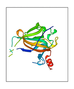 These views are prepared from three orthologuous viewpoints with MolScript. Secondary structures are determined from the C-alpha atom positions of your protein (N-terminal blue, C-terminal red).