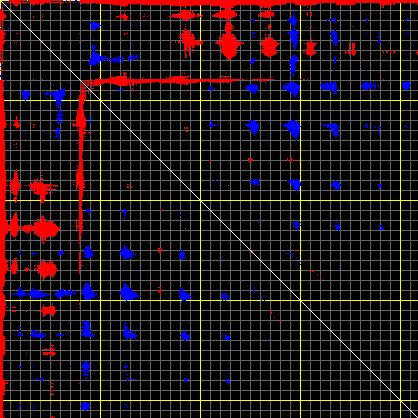 This matrix displays the maximum distance fluctuations between all pairs of CA atoms and between the two extreme conformations that were computed for this mode (DQMIN/DQMAX). Distance increases are plotted in blue and decreases in red for the strongest 10% of the residue pair distance changes. Every pixel corresponds to a single residue. Grey lines are drawn every 10 residues, yellow lines every 100 residues (counting from the upper left corner).