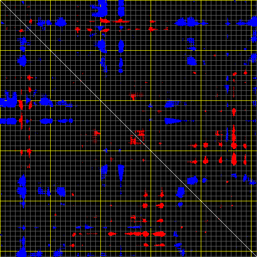 This matrix displays the maximum distance fluctuations between all pairs of CA atoms and between the two extreme conformations that were computed for this mode (DQMIN/DQMAX). Distance increases are plotted in blue and decreases in red for the strongest 10% of the residue pair distance changes. Every pixel corresponds to a single residue. Grey lines are drawn every 10 residues, yellow lines every 100 residues (counting from the upper left corner).