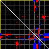 This matrix displays the maximum distance fluctuations between all pairs of CA atoms and between the two extreme conformations that were computed for this mode (DQMIN/DQMAX). Distance increases are plotted in blue and decreases in red for the strongest 10% of the residue pair distance changes. Every pixel corresponds to a single residue. Grey lines are drawn every 10 residues, yellow lines every 100 residues (counting from the upper left corner).