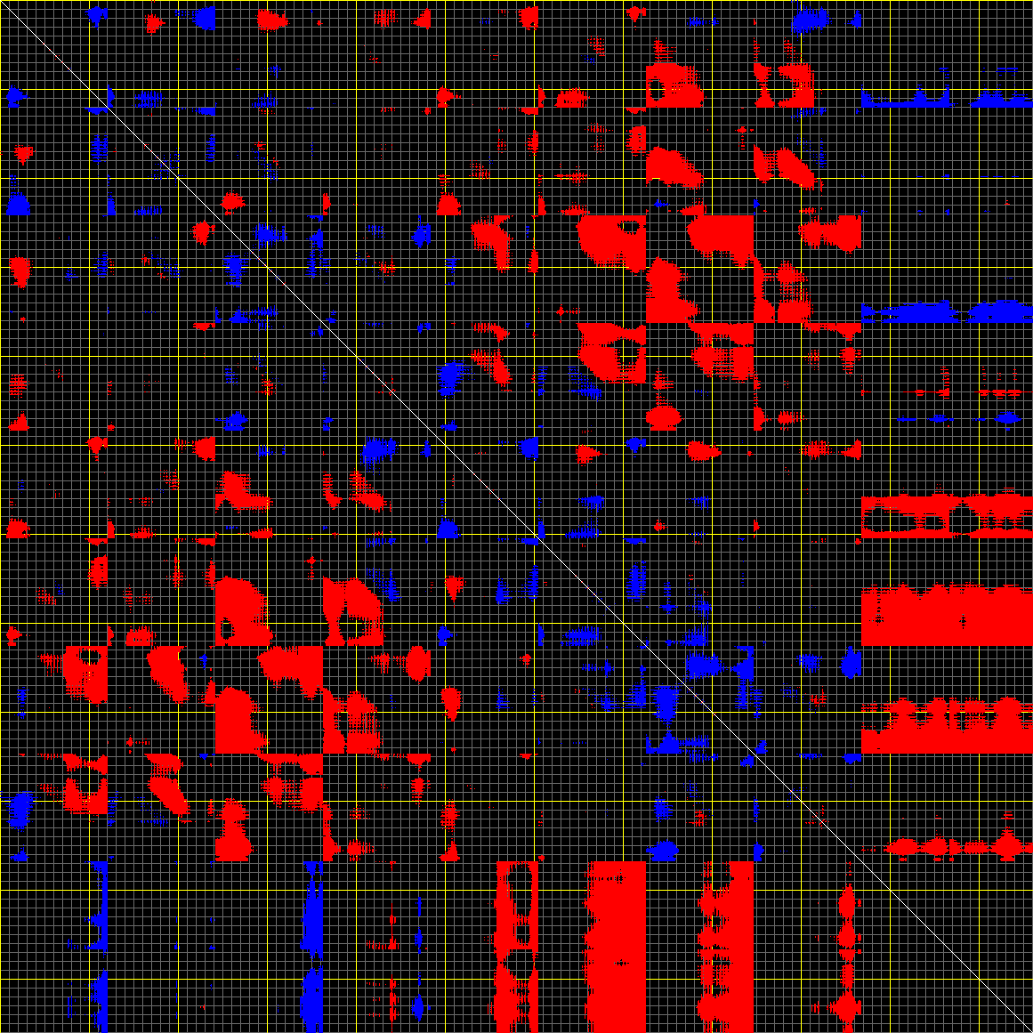 This matrix displays the maximum distance fluctuations between all pairs of CA atoms and between the two extreme conformations that were computed for this mode (DQMIN/DQMAX). Distance increases are plotted in blue and decreases in red for the strongest 10% of the residue pair distance changes. Every pixel corresponds to a single residue. Grey lines are drawn every 10 residues, yellow lines every 100 residues (counting from the upper left corner).