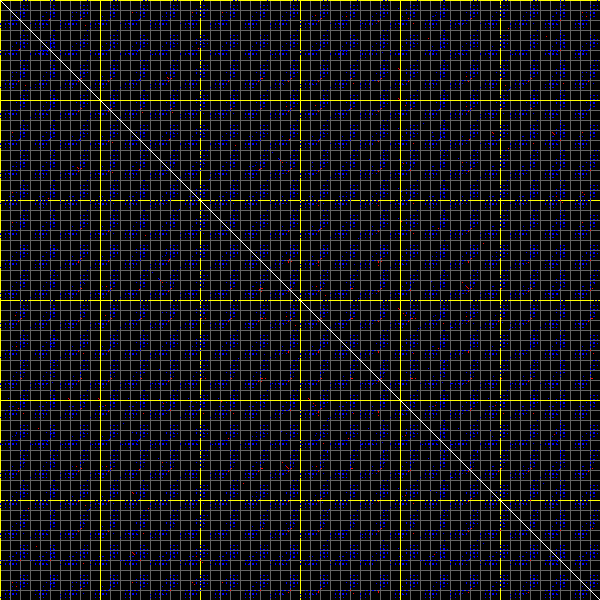 This matrix displays the maximum distance fluctuations between all pairs of CA atoms and between the two extreme conformations that were computed for this mode (DQMIN/DQMAX). Distance increases are plotted in blue and decreases in red for the strongest 10% of the residue pair distance changes. Every pixel corresponds to a single residue. Grey lines are drawn every 10 residues, yellow lines every 100 residues (counting from the upper left corner).