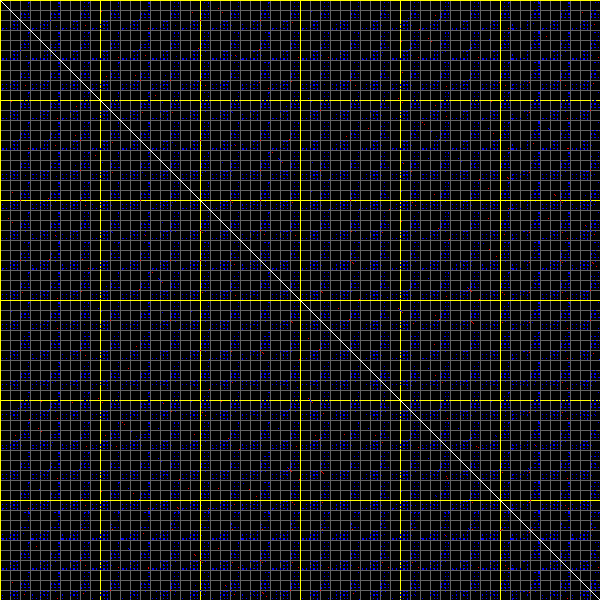 This matrix displays the maximum distance fluctuations between all pairs of CA atoms and between the two extreme conformations that were computed for this mode (DQMIN/DQMAX). Distance increases are plotted in blue and decreases in red for the strongest 10% of the residue pair distance changes. Every pixel corresponds to a single residue. Grey lines are drawn every 10 residues, yellow lines every 100 residues (counting from the upper left corner).