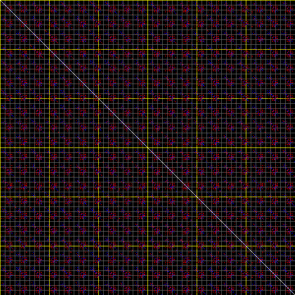 This matrix displays the maximum distance fluctuations between all pairs of CA atoms and between the two extreme conformations that were computed for this mode (DQMIN/DQMAX). Distance increases are plotted in blue and decreases in red for the strongest 10% of the residue pair distance changes. Every pixel corresponds to a single residue. Grey lines are drawn every 10 residues, yellow lines every 100 residues (counting from the upper left corner).