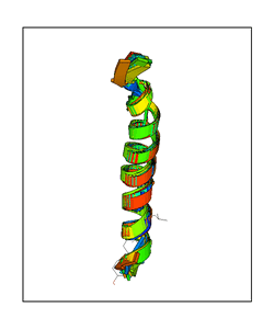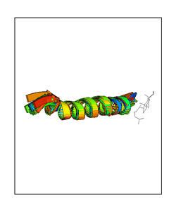 CAUTION: The amplitude range presented in these views corresponds to the highest (DQMAX) and lowest (DQMIN) perturbations chosen for this mode. Secondary structures can break down (and thus disappear from the animation) if the applied amplitudes are too large for Molscript to identify them. The choice of the amplitude is not a NMA result, but has to be done by the user on physical grounds. To change the amplitude range, you can recompute the animation of the desired mode by using the "Compute additional perturbed models with elNémo" section on the results page of your job.