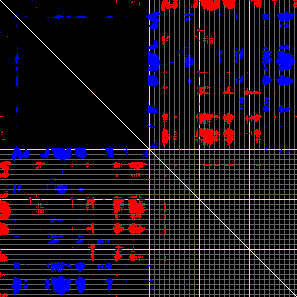 This matrix displays the maximum distance fluctuations between all pairs of CA atoms and between the two extreme conformations that were computed for this mode (DQMIN/DQMAX). Distance increases are plotted in blue and decreases in red for the strongest 10% of the residue pair distance changes. Every pixel corresponds to a single residue. Grey lines are drawn every 10 residues, yellow lines every 100 residues (counting from the upper left corner).