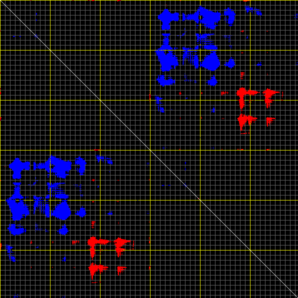 This matrix displays the maximum distance fluctuations between all pairs of CA atoms and between the two extreme conformations that were computed for this mode (DQMIN/DQMAX). Distance increases are plotted in blue and decreases in red for the strongest 10% of the residue pair distance changes. Every pixel corresponds to a single residue. Grey lines are drawn every 10 residues, yellow lines every 100 residues (counting from the upper left corner).