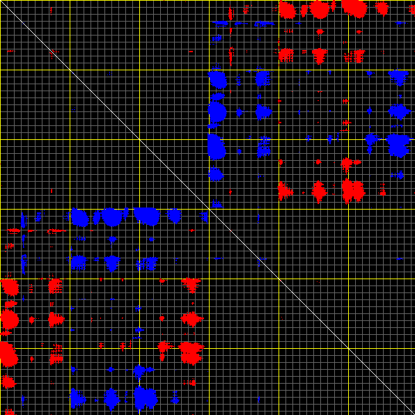 This matrix displays the maximum distance fluctuations between all pairs of CA atoms and between the two extreme conformations that were computed for this mode (DQMIN/DQMAX). Distance increases are plotted in blue and decreases in red for the strongest 10% of the residue pair distance changes. Every pixel corresponds to a single residue. Grey lines are drawn every 10 residues, yellow lines every 100 residues (counting from the upper left corner).