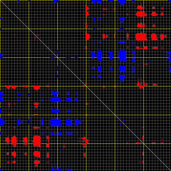 This matrix displays the maximum distance fluctuations between all pairs of CA atoms and between the two extreme conformations that were computed for this mode (DQMIN/DQMAX). Distance increases are plotted in blue and decreases in red for the strongest 10% of the residue pair distance changes. Every pixel corresponds to a single residue. Grey lines are drawn every 10 residues, yellow lines every 100 residues (counting from the upper left corner).