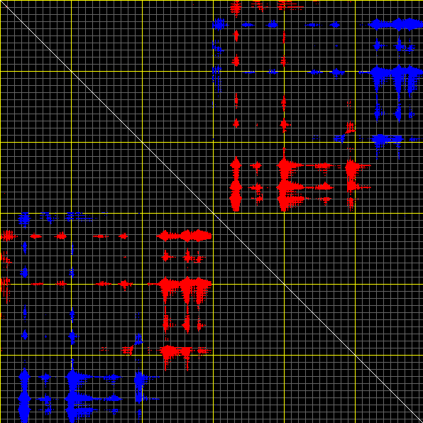 This matrix displays the maximum distance fluctuations between all pairs of CA atoms and between the two extreme conformations that were computed for this mode (DQMIN/DQMAX). Distance increases are plotted in blue and decreases in red for the strongest 10% of the residue pair distance changes. Every pixel corresponds to a single residue. Grey lines are drawn every 10 residues, yellow lines every 100 residues (counting from the upper left corner).
