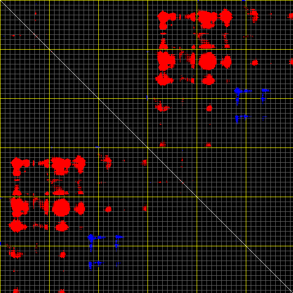 This matrix displays the maximum distance fluctuations between all pairs of CA atoms and between the two extreme conformations that were computed for this mode (DQMIN/DQMAX). Distance increases are plotted in blue and decreases in red for the strongest 10% of the residue pair distance changes. Every pixel corresponds to a single residue. Grey lines are drawn every 10 residues, yellow lines every 100 residues (counting from the upper left corner).