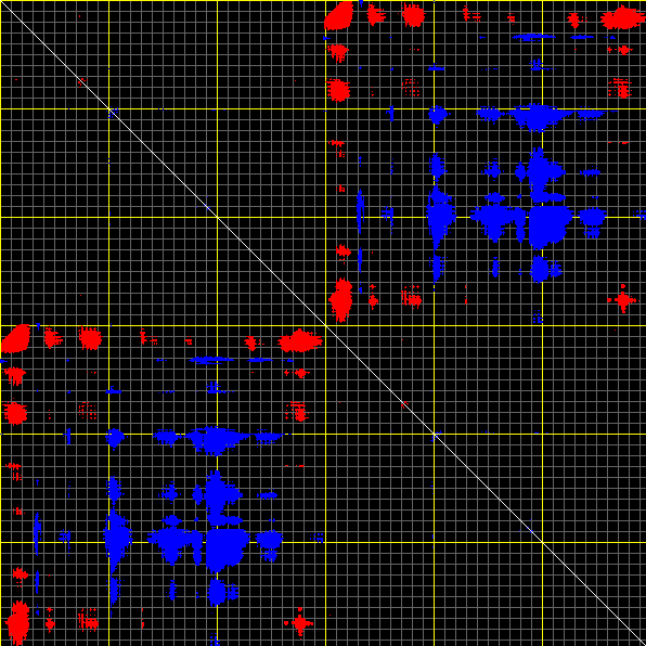 This matrix displays the maximum distance fluctuations between all pairs of CA atoms and between the two extreme conformations that were computed for this mode (DQMIN/DQMAX). Distance increases are plotted in blue and decreases in red for the strongest 10% of the residue pair distance changes. Every pixel corresponds to a single residue. Grey lines are drawn every 10 residues, yellow lines every 100 residues (counting from the upper left corner).