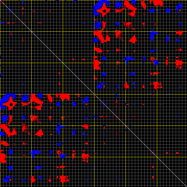 This matrix displays the maximum distance fluctuations between all pairs of CA atoms and between the two extreme conformations that were computed for this mode (DQMIN/DQMAX). Distance increases are plotted in blue and decreases in red for the strongest 10% of the residue pair distance changes. Every pixel corresponds to a single residue. Grey lines are drawn every 10 residues, yellow lines every 100 residues (counting from the upper left corner).