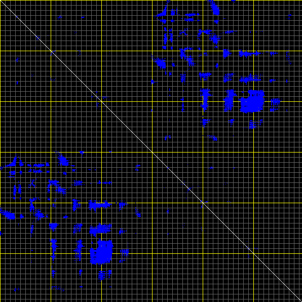This matrix displays the maximum distance fluctuations between all pairs of CA atoms and between the two extreme conformations that were computed for this mode (DQMIN/DQMAX). Distance increases are plotted in blue and decreases in red for the strongest 10% of the residue pair distance changes. Every pixel corresponds to a single residue. Grey lines are drawn every 10 residues, yellow lines every 100 residues (counting from the upper left corner).