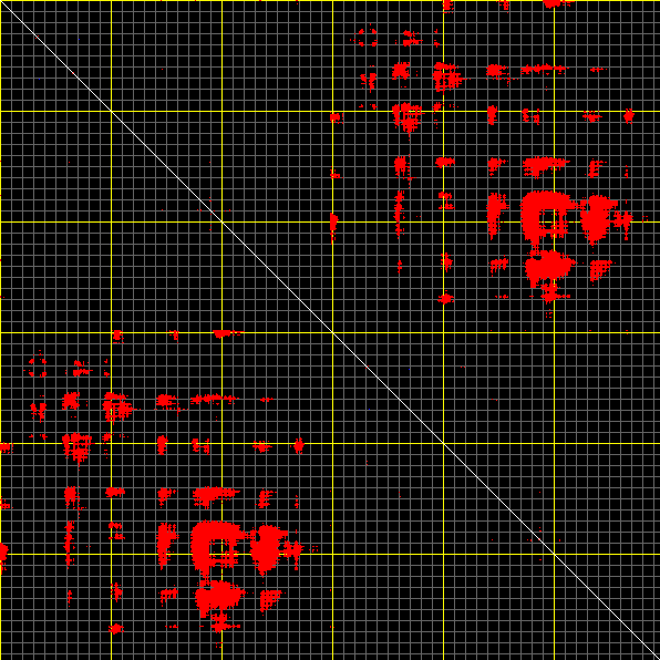 This matrix displays the maximum distance fluctuations between all pairs of CA atoms and between the two extreme conformations that were computed for this mode (DQMIN/DQMAX). Distance increases are plotted in blue and decreases in red for the strongest 10% of the residue pair distance changes. Every pixel corresponds to a single residue. Grey lines are drawn every 10 residues, yellow lines every 100 residues (counting from the upper left corner).