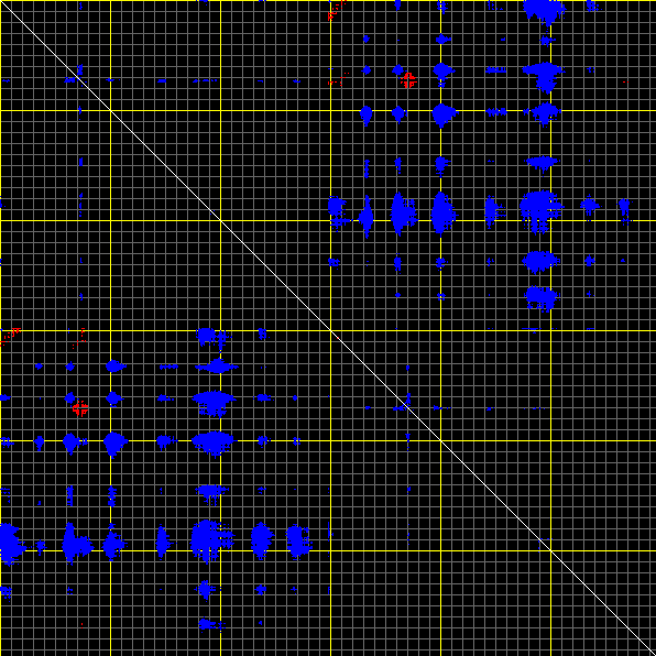 This matrix displays the maximum distance fluctuations between all pairs of CA atoms and between the two extreme conformations that were computed for this mode (DQMIN/DQMAX). Distance increases are plotted in blue and decreases in red for the strongest 10% of the residue pair distance changes. Every pixel corresponds to a single residue. Grey lines are drawn every 10 residues, yellow lines every 100 residues (counting from the upper left corner).