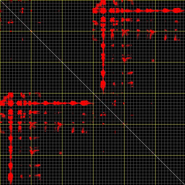 This matrix displays the maximum distance fluctuations between all pairs of CA atoms and between the two extreme conformations that were computed for this mode (DQMIN/DQMAX). Distance increases are plotted in blue and decreases in red for the strongest 10% of the residue pair distance changes. Every pixel corresponds to a single residue. Grey lines are drawn every 10 residues, yellow lines every 100 residues (counting from the upper left corner).