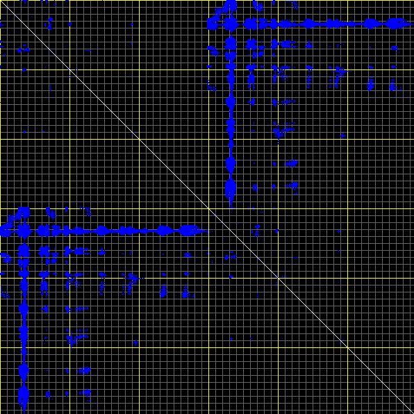 This matrix displays the maximum distance fluctuations between all pairs of CA atoms and between the two extreme conformations that were computed for this mode (DQMIN/DQMAX). Distance increases are plotted in blue and decreases in red for the strongest 10% of the residue pair distance changes. Every pixel corresponds to a single residue. Grey lines are drawn every 10 residues, yellow lines every 100 residues (counting from the upper left corner).