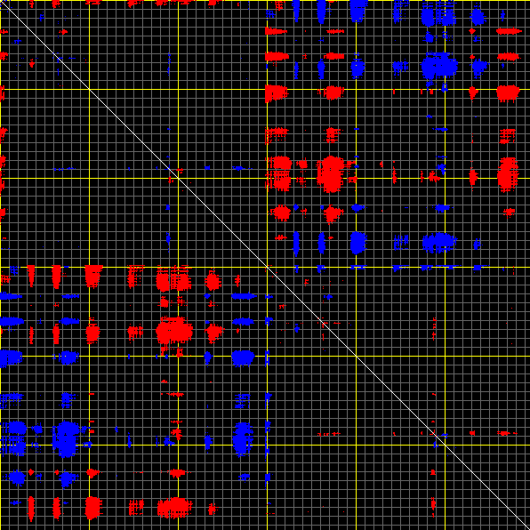 This matrix displays the maximum distance fluctuations between all pairs of CA atoms and between the two extreme conformations that were computed for this mode (DQMIN/DQMAX). Distance increases are plotted in blue and decreases in red for the strongest 10% of the residue pair distance changes. Every pixel corresponds to a single residue. Grey lines are drawn every 10 residues, yellow lines every 100 residues (counting from the upper left corner).