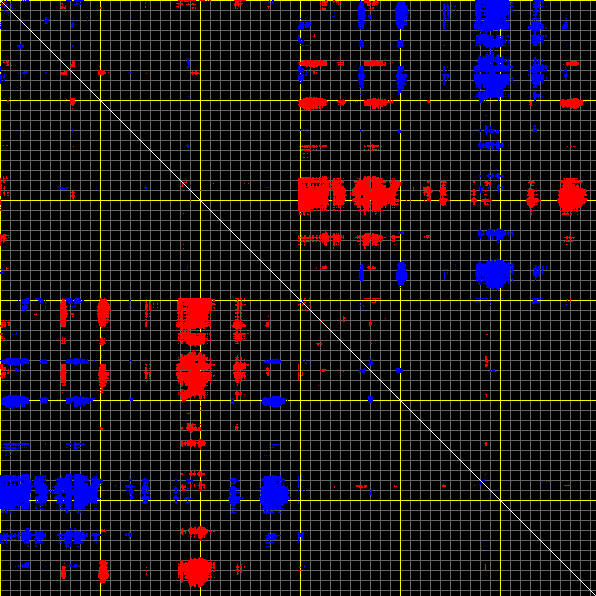 This matrix displays the maximum distance fluctuations between all pairs of CA atoms and between the two extreme conformations that were computed for this mode (DQMIN/DQMAX). Distance increases are plotted in blue and decreases in red for the strongest 10% of the residue pair distance changes. Every pixel corresponds to a single residue. Grey lines are drawn every 10 residues, yellow lines every 100 residues (counting from the upper left corner).