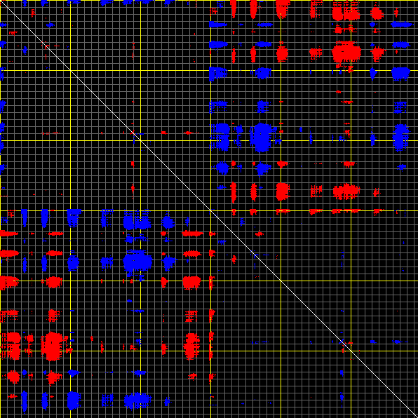 This matrix displays the maximum distance fluctuations between all pairs of CA atoms and between the two extreme conformations that were computed for this mode (DQMIN/DQMAX). Distance increases are plotted in blue and decreases in red for the strongest 10% of the residue pair distance changes. Every pixel corresponds to a single residue. Grey lines are drawn every 10 residues, yellow lines every 100 residues (counting from the upper left corner).