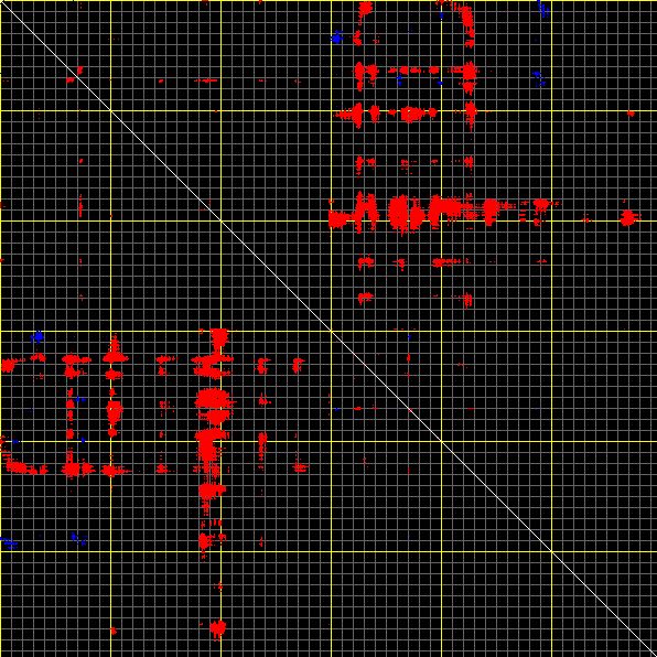 This matrix displays the maximum distance fluctuations between all pairs of CA atoms and between the two extreme conformations that were computed for this mode (DQMIN/DQMAX). Distance increases are plotted in blue and decreases in red for the strongest 10% of the residue pair distance changes. Every pixel corresponds to a single residue. Grey lines are drawn every 10 residues, yellow lines every 100 residues (counting from the upper left corner).