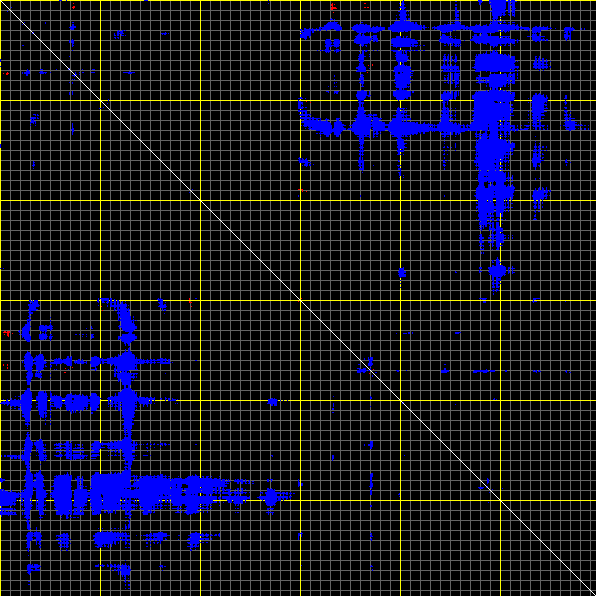 This matrix displays the maximum distance fluctuations between all pairs of CA atoms and between the two extreme conformations that were computed for this mode (DQMIN/DQMAX). Distance increases are plotted in blue and decreases in red for the strongest 10% of the residue pair distance changes. Every pixel corresponds to a single residue. Grey lines are drawn every 10 residues, yellow lines every 100 residues (counting from the upper left corner).