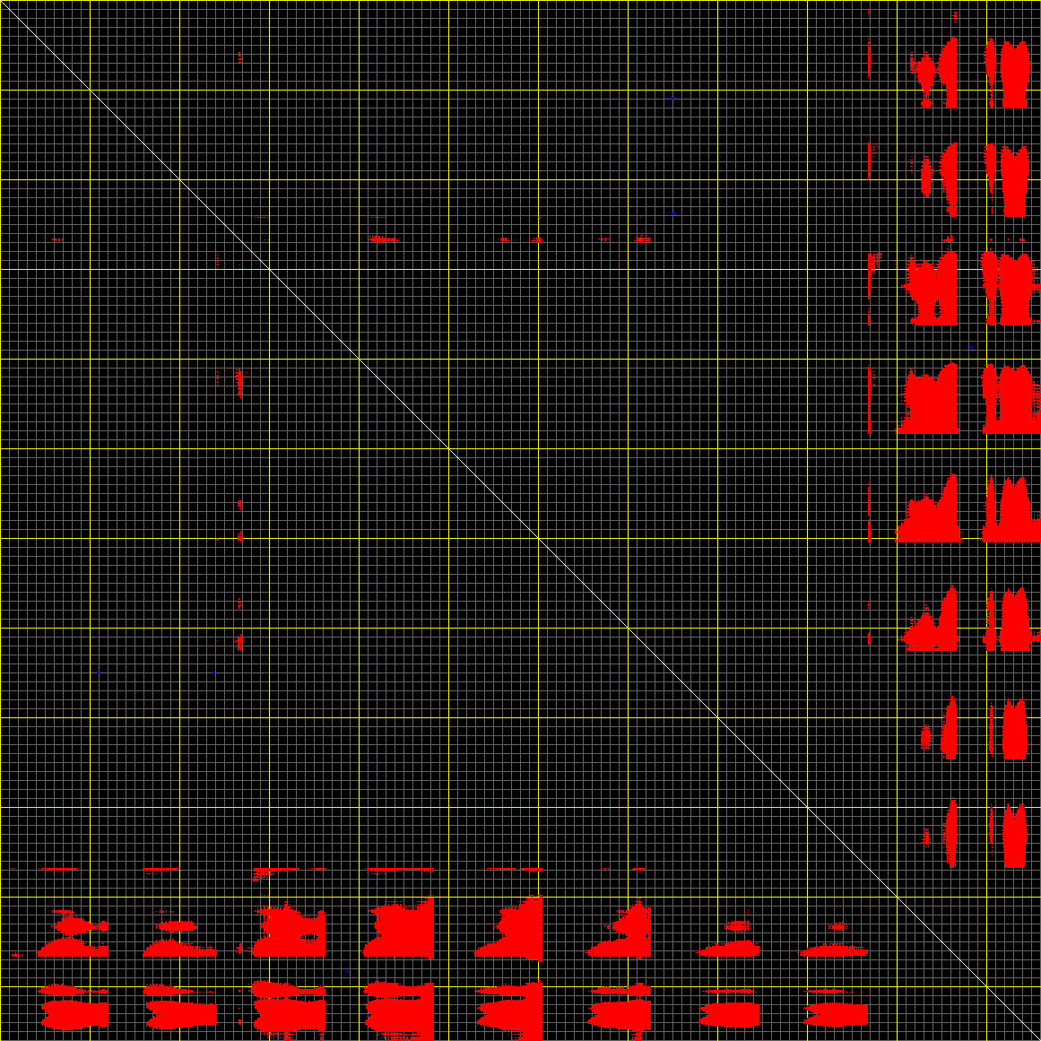 This matrix displays the maximum distance fluctuations between all pairs of CA atoms and between the two extreme conformations that were computed for this mode (DQMIN/DQMAX). Distance increases are plotted in blue and decreases in red for the strongest 10% of the residue pair distance changes. Every pixel corresponds to a single residue. Grey lines are drawn every 10 residues, yellow lines every 100 residues (counting from the upper left corner).