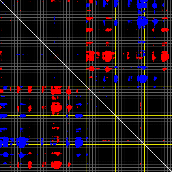 This matrix displays the maximum distance fluctuations between all pairs of CA atoms and between the two extreme conformations that were computed for this mode (DQMIN/DQMAX). Distance increases are plotted in blue and decreases in red for the strongest 10% of the residue pair distance changes. Every pixel corresponds to a single residue. Grey lines are drawn every 10 residues, yellow lines every 100 residues (counting from the upper left corner).