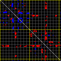 This matrix displays the maximum distance fluctuations between all pairs of CA atoms and between the two extreme conformations that were computed for this mode (DQMIN/DQMAX). Distance increases are plotted in blue and decreases in red for the strongest 10% of the residue pair distance changes. Every pixel corresponds to a single residue. Grey lines are drawn every 10 residues, yellow lines every 100 residues (counting from the upper left corner).