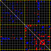 This matrix displays the maximum distance fluctuations between all pairs of CA atoms and between the two extreme conformations that were computed for this mode (DQMIN/DQMAX). Distance increases are plotted in blue and decreases in red for the strongest 10% of the residue pair distance changes. Every pixel corresponds to a single residue. Grey lines are drawn every 10 residues, yellow lines every 100 residues (counting from the upper left corner).