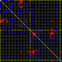 This matrix displays the maximum distance fluctuations between all pairs of CA atoms and between the two extreme conformations that were computed for this mode (DQMIN/DQMAX). Distance increases are plotted in blue and decreases in red for the strongest 10% of the residue pair distance changes. Every pixel corresponds to a single residue. Grey lines are drawn every 10 residues, yellow lines every 100 residues (counting from the upper left corner).