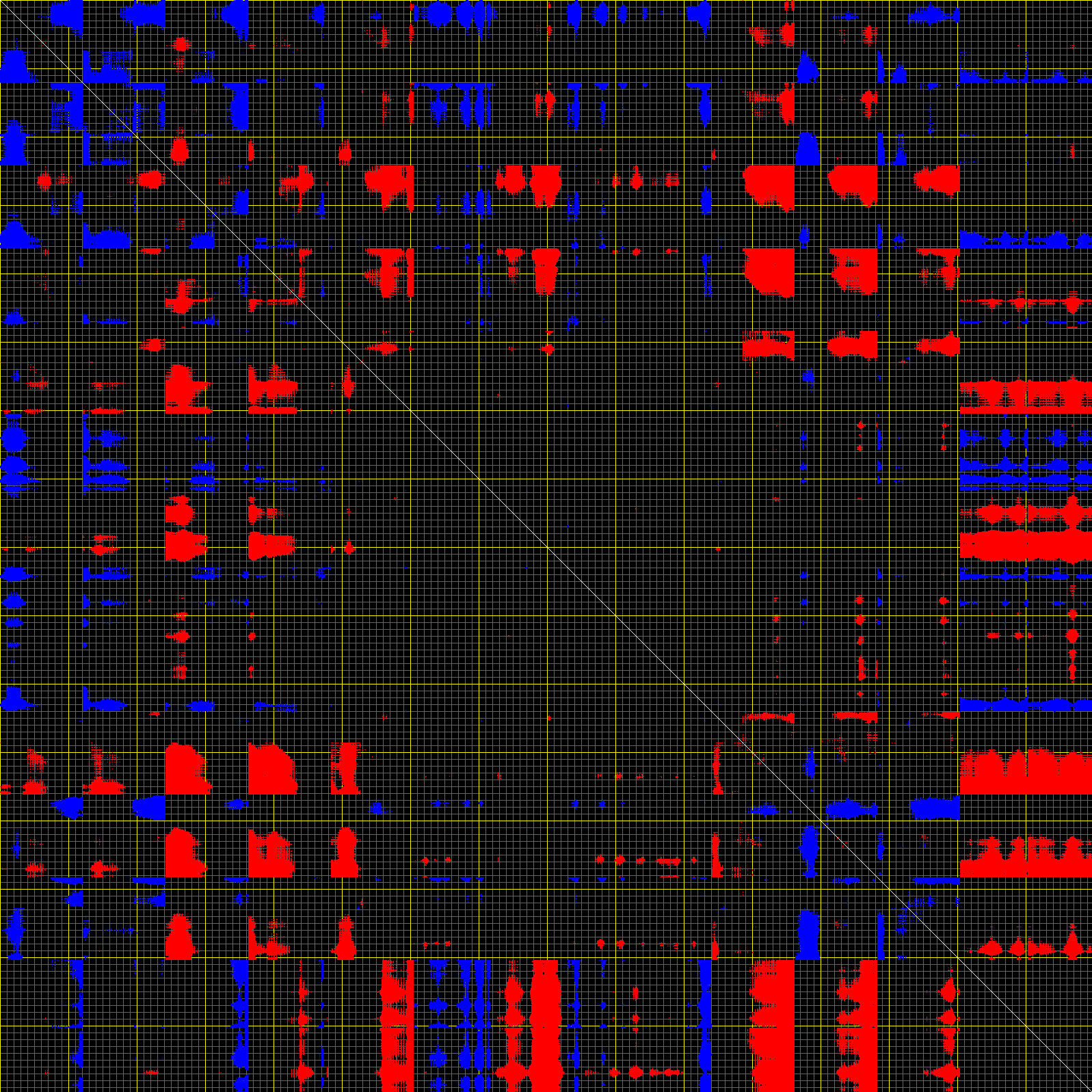 This matrix displays the maximum distance fluctuations between all pairs of CA atoms and between the two extreme conformations that were computed for this mode (DQMIN/DQMAX). Distance increases are plotted in blue and decreases in red for the strongest 10% of the residue pair distance changes. Every pixel corresponds to a single residue. Grey lines are drawn every 10 residues, yellow lines every 100 residues (counting from the upper left corner).