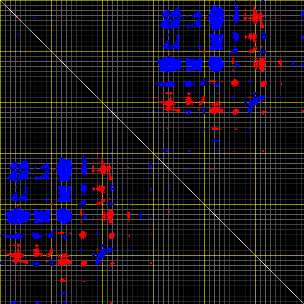 This matrix displays the maximum distance fluctuations between all pairs of CA atoms and between the two extreme conformations that were computed for this mode (DQMIN/DQMAX). Distance increases are plotted in blue and decreases in red for the strongest 10% of the residue pair distance changes. Every pixel corresponds to a single residue. Grey lines are drawn every 10 residues, yellow lines every 100 residues (counting from the upper left corner).