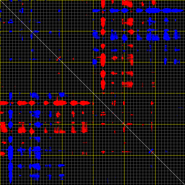 This matrix displays the maximum distance fluctuations between all pairs of CA atoms and between the two extreme conformations that were computed for this mode (DQMIN/DQMAX). Distance increases are plotted in blue and decreases in red for the strongest 10% of the residue pair distance changes. Every pixel corresponds to a single residue. Grey lines are drawn every 10 residues, yellow lines every 100 residues (counting from the upper left corner).