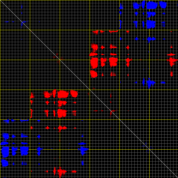 This matrix displays the maximum distance fluctuations between all pairs of CA atoms and between the two extreme conformations that were computed for this mode (DQMIN/DQMAX). Distance increases are plotted in blue and decreases in red for the strongest 10% of the residue pair distance changes. Every pixel corresponds to a single residue. Grey lines are drawn every 10 residues, yellow lines every 100 residues (counting from the upper left corner).