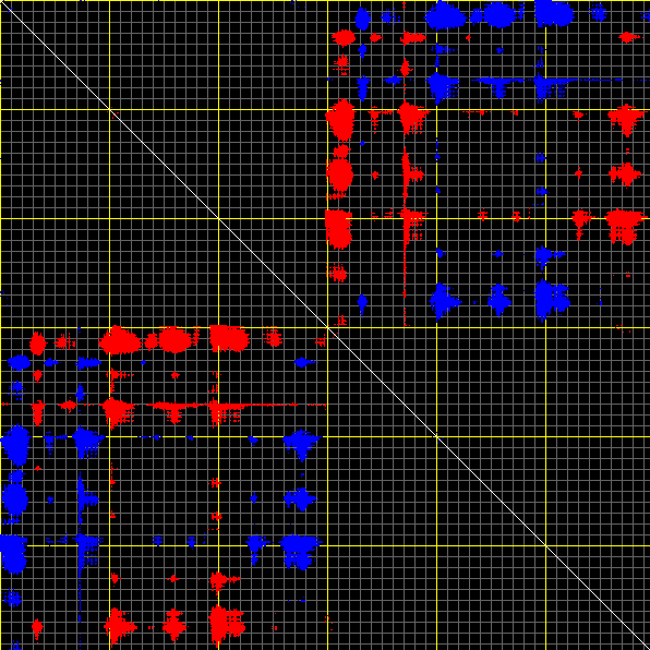 This matrix displays the maximum distance fluctuations between all pairs of CA atoms and between the two extreme conformations that were computed for this mode (DQMIN/DQMAX). Distance increases are plotted in blue and decreases in red for the strongest 10% of the residue pair distance changes. Every pixel corresponds to a single residue. Grey lines are drawn every 10 residues, yellow lines every 100 residues (counting from the upper left corner).