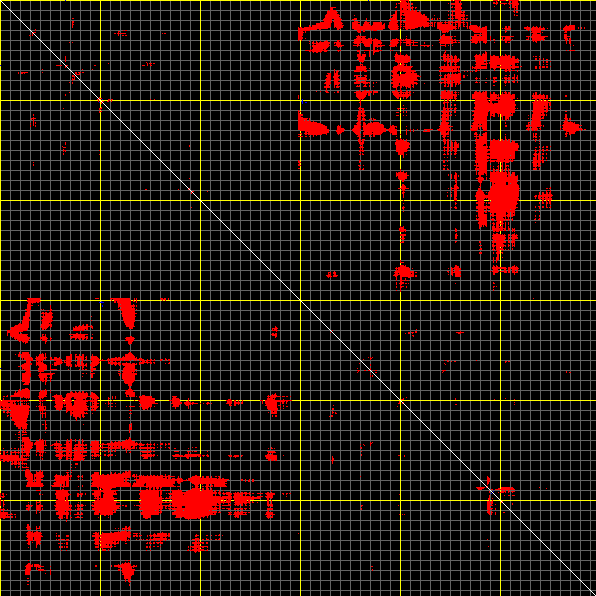 This matrix displays the maximum distance fluctuations between all pairs of CA atoms and between the two extreme conformations that were computed for this mode (DQMIN/DQMAX). Distance increases are plotted in blue and decreases in red for the strongest 10% of the residue pair distance changes. Every pixel corresponds to a single residue. Grey lines are drawn every 10 residues, yellow lines every 100 residues (counting from the upper left corner).