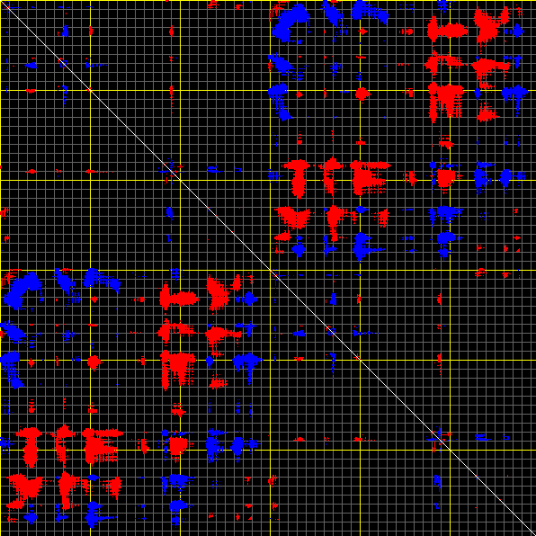 This matrix displays the maximum distance fluctuations between all pairs of CA atoms and between the two extreme conformations that were computed for this mode (DQMIN/DQMAX). Distance increases are plotted in blue and decreases in red for the strongest 10% of the residue pair distance changes. Every pixel corresponds to a single residue. Grey lines are drawn every 10 residues, yellow lines every 100 residues (counting from the upper left corner).