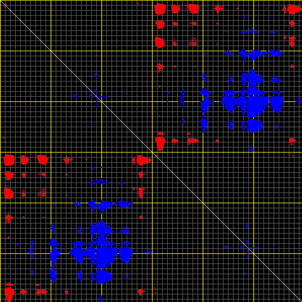 This matrix displays the maximum distance fluctuations between all pairs of CA atoms and between the two extreme conformations that were computed for this mode (DQMIN/DQMAX). Distance increases are plotted in blue and decreases in red for the strongest 10% of the residue pair distance changes. Every pixel corresponds to a single residue. Grey lines are drawn every 10 residues, yellow lines every 100 residues (counting from the upper left corner).