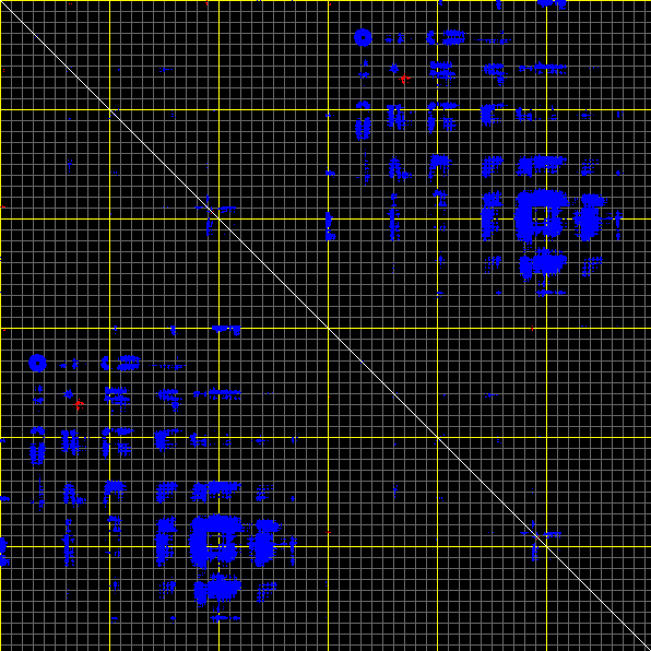This matrix displays the maximum distance fluctuations between all pairs of CA atoms and between the two extreme conformations that were computed for this mode (DQMIN/DQMAX). Distance increases are plotted in blue and decreases in red for the strongest 10% of the residue pair distance changes. Every pixel corresponds to a single residue. Grey lines are drawn every 10 residues, yellow lines every 100 residues (counting from the upper left corner).