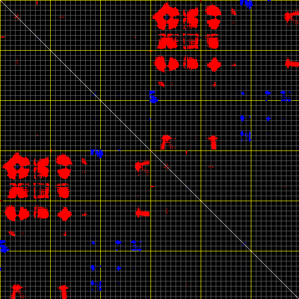 This matrix displays the maximum distance fluctuations between all pairs of CA atoms and between the two extreme conformations that were computed for this mode (DQMIN/DQMAX). Distance increases are plotted in blue and decreases in red for the strongest 10% of the residue pair distance changes. Every pixel corresponds to a single residue. Grey lines are drawn every 10 residues, yellow lines every 100 residues (counting from the upper left corner).